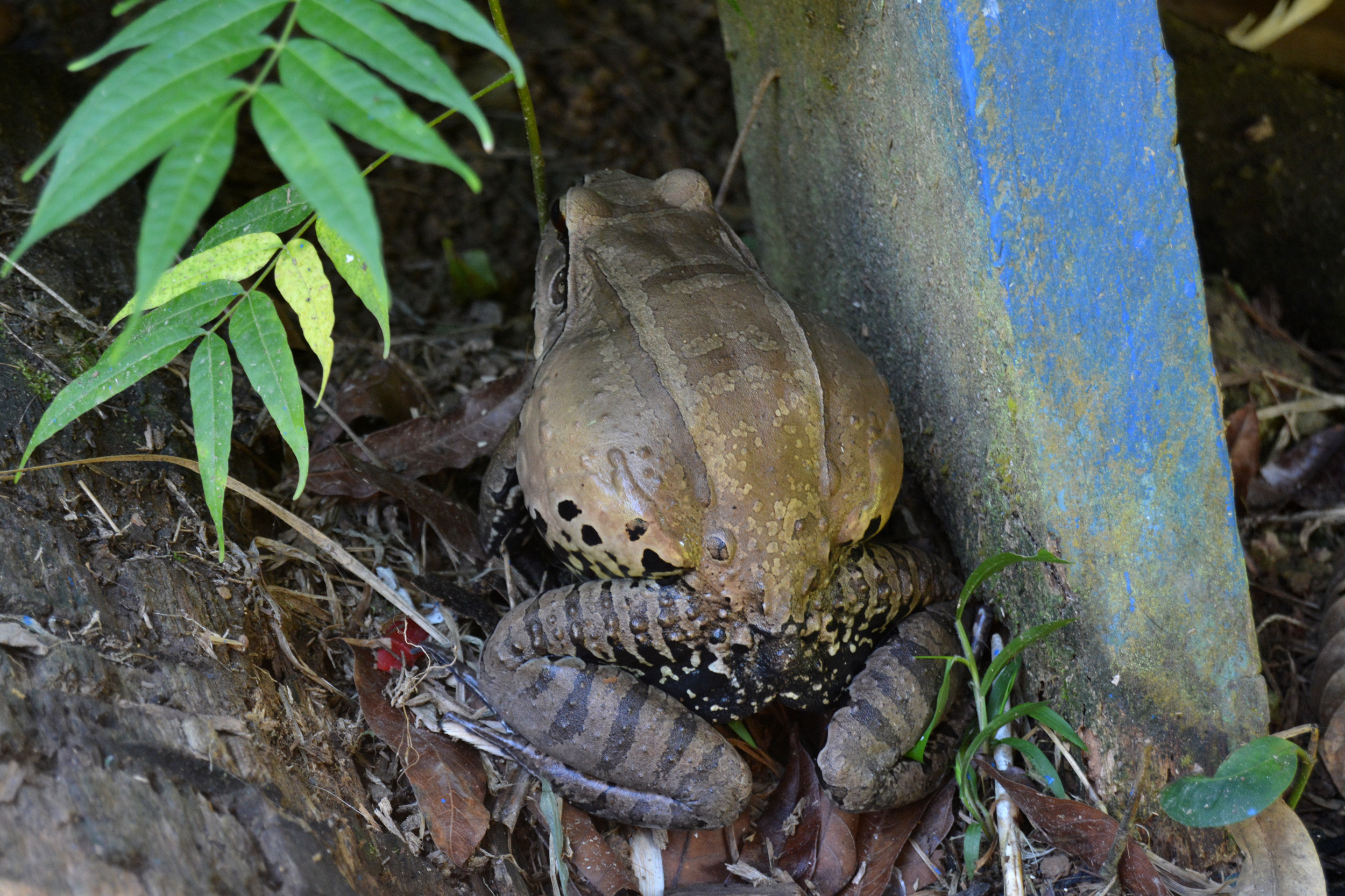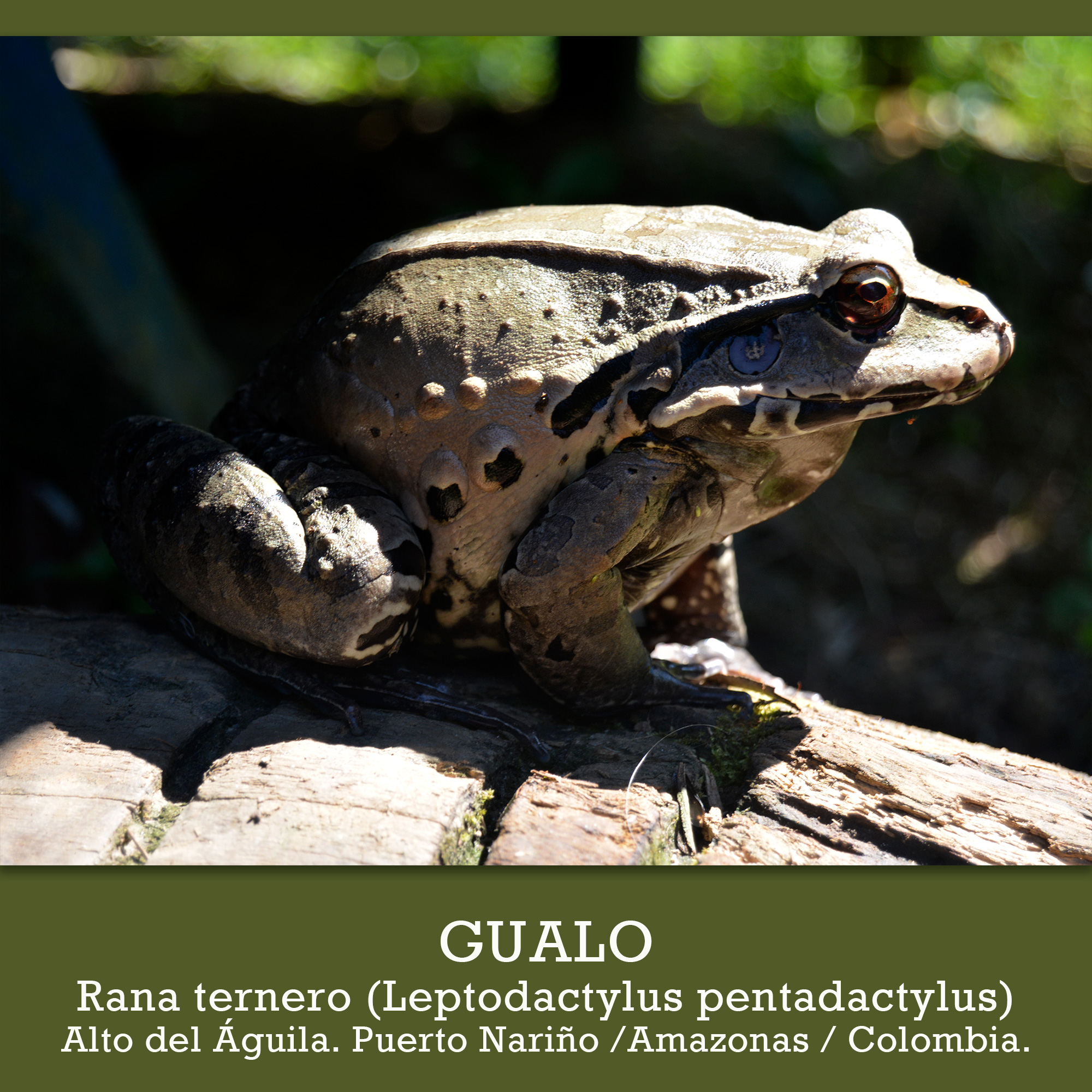 El Gualo, así llaman a esta rana o sapo en la Amazonía colombiana. Si en noches de tormenta o alta humedad esta cerca de tu cabaña, tienes un problema, sus gritos no te dejaran dormir.😆 (Bueno a mi si, que yo me duermo si o si). Nombre científico: Leptodactylus Pentadactylus.