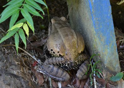 Mide unos 20 o 25 cm es autóctona de estas selvas. Esta estaba al pie de mi cabaña en Las Cabañas del Fray, Alto del Águila, Puerto Nariño, Amazonas. Agosto de 2023.